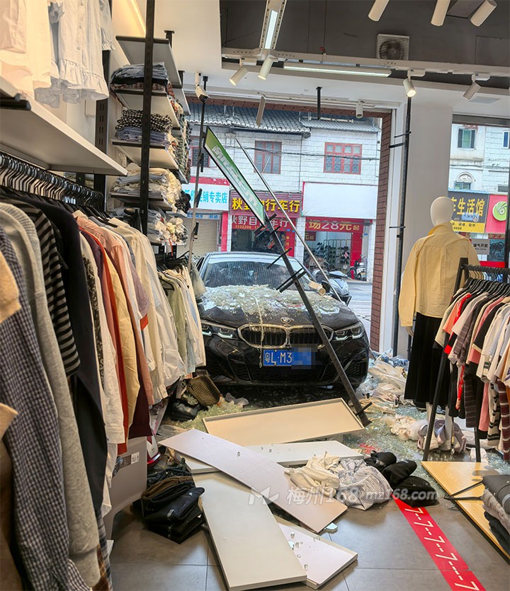 兴宁兴田路一间卖衣服的店被车给撞了