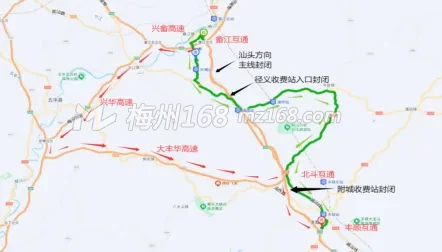 往梅州方向丰顺互通至畲江互通、往汕头方向畲江互通至北斗互通主线路段封闭。
