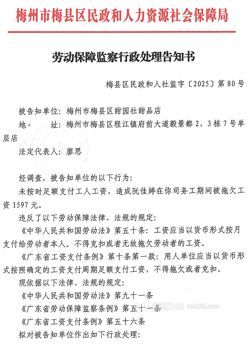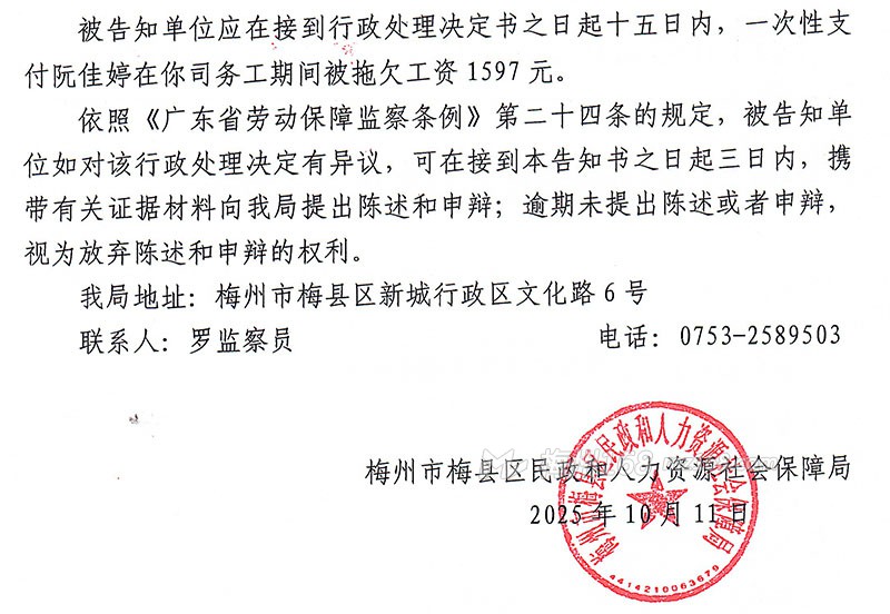 我局查处你单位拖欠阮佳婷工资一案,因无法联系你单位,依照《中华人民共和国民事诉讼法》第九十五条、《广东省劳动保障监察条例》第四十七条规定,现向你单位公告送达《劳动保障监察行政处理告知书》(梅县区民政和人社监字〔2025〕第80号),自公告之日起经过30日,即视为送达。