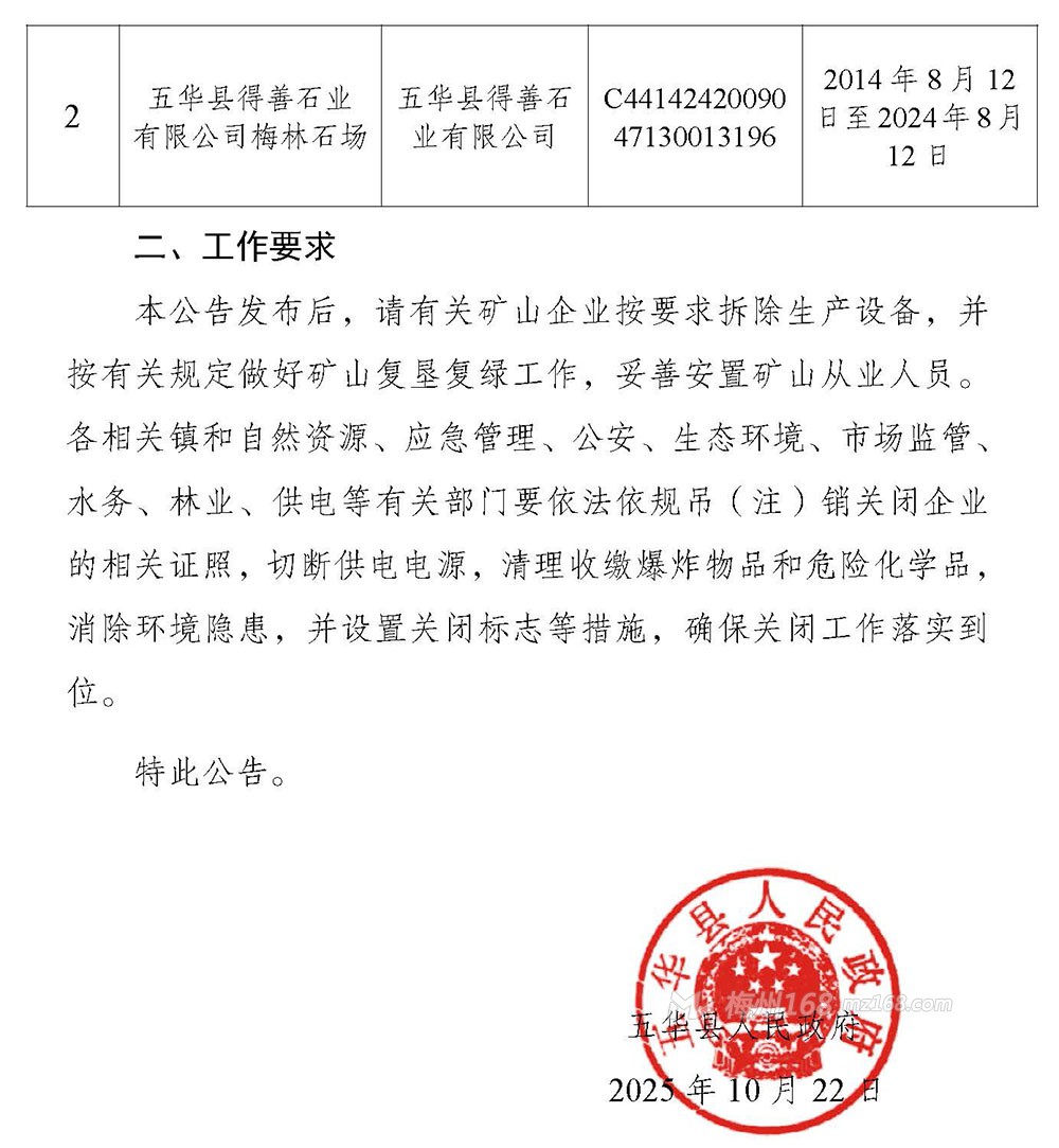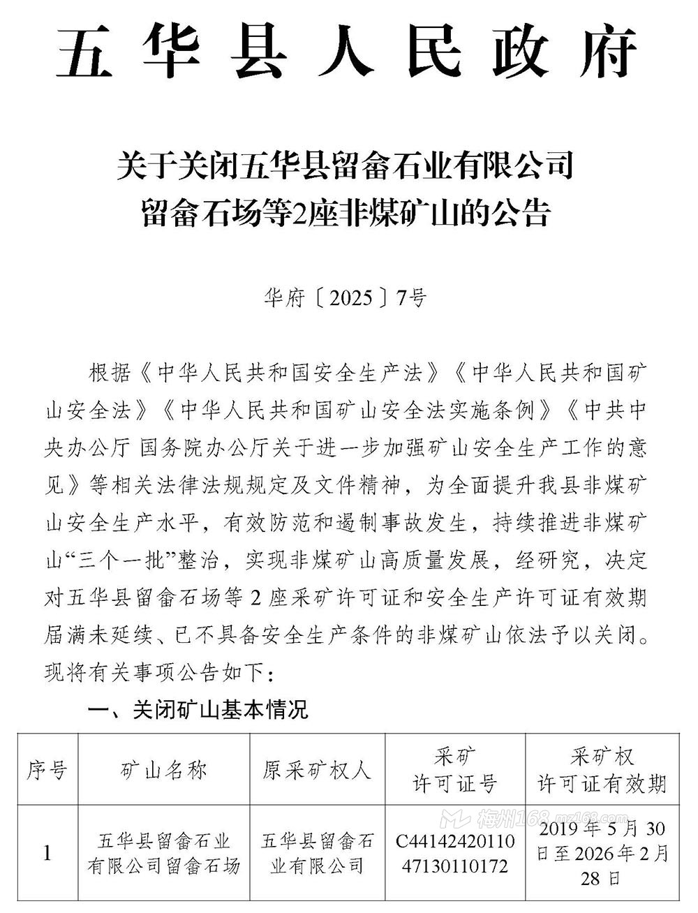 原文下载:7号五华县人民政府关于关闭五华县留畲石业有限公司留畲石场等2座非煤矿山的公告.pdf