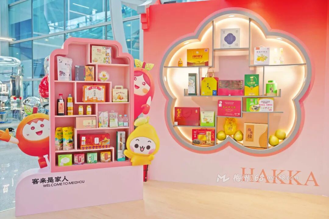 走进展台,雁南飞绿茶、雁球牌米粉等梅县农业龙头企业的名优产品整齐陈列。国内外旅客只需扫码下单,即可品尝“梅州味道”、感受“客家匠心”,以此开启一场“云游梅县”之旅。