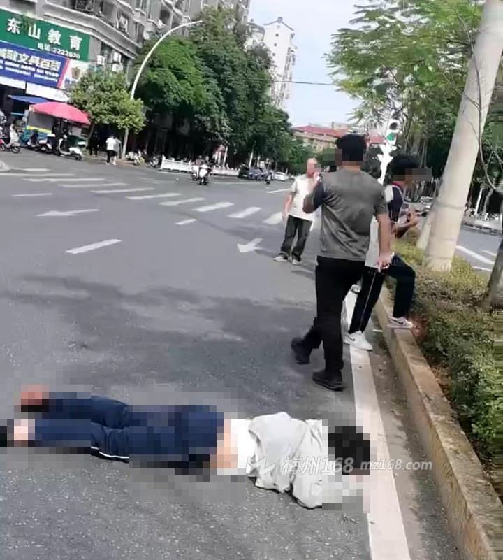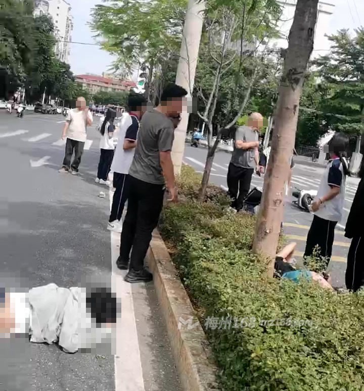 据梅州168网友爆料,今天(10月30日)刚刚一点多,在梅州市梅县区某中学门口斑马线红绿灯路段发生一起事故!一人倒在花带上,不远处还有一辆摩托车倒在地上,花带另一边,还有一人趴倒在地上,看上去受伤有点重……