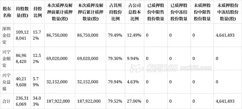 广东明珠(SH 600382,收盘价:7.39元)10月29日晚间发布公告称,截至本公告披露日,广东明珠集团股份有限公司控股股东一致行动人兴宁市金顺安投资有限公司持有公司股份数量约为8697万股,占公司总股本比例为12.52%;2025年10月28日,兴宁金顺安质押1330万股,占其持股数量比例的15.29%,占公司总股本比例为1.92%;2025年10月29日,兴宁金顺安解除质押股份数量共1330万股,占其持股数量比例为15.29%,占公司总股本比例为1.92%。截至本公告披露日,公司控股股东深圳市金信安投资有限公司及其一致行动人兴宁金顺安、兴宁市众益福投资有限公司合计持有公司约2.36亿股,占公司总股本比例的34.03%;合计质押股份数约为1.88亿股,占合计持股数量比例的79.52%,占公司总股本的27.06%。