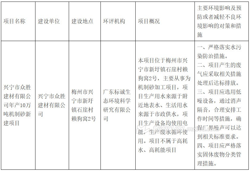 根据兴宁市众胜建材有限公司年产10万吨机制砂新建项目环境影响报告表等,按照建设项目环境影响评价审批程序的有关规定,我局拟对该项目环境影响评价文件作出批准决定。为体现公开、公正的原则,强化公众参与,现予公示。公示期5个工作日(2025年10月31日至2025年11月6日)。如有意见,请在公示期内来信或来电向我局反映。