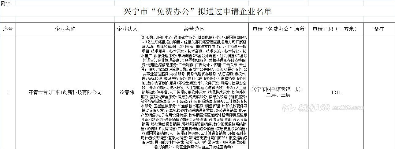 根据《梅州市实施免费办公工作方案试行》《梅州市“免费办公”管理实施细则(试行)》等文件精神,经牵头主管部门审核,拟通过汗青云台(广东)创新科技有限公司申请兴宁市图书馆老馆一至三层作为“免费办公”场所,现予公示(名单附后)。