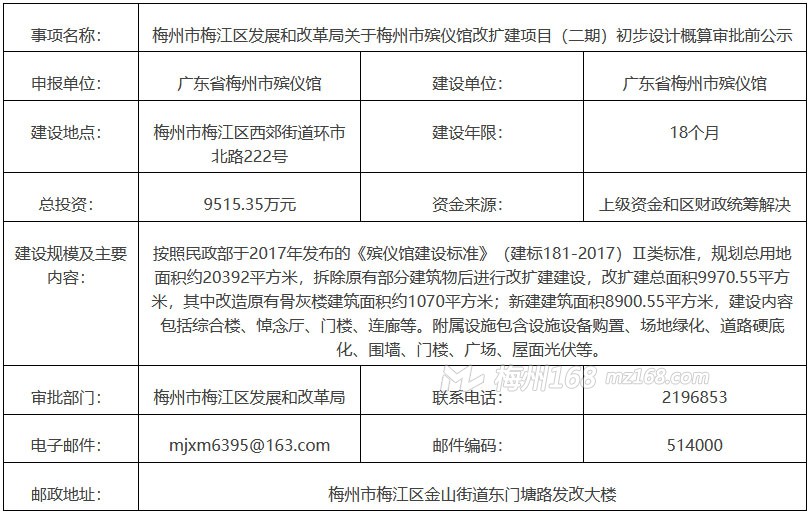 梅州市梅江区发展和改革局关于梅州市殡仪馆改扩建项目(二期)初步设计概算审批前公示