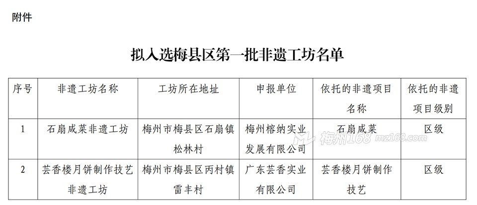 拟入选梅县区第一批非遗工坊名单公示